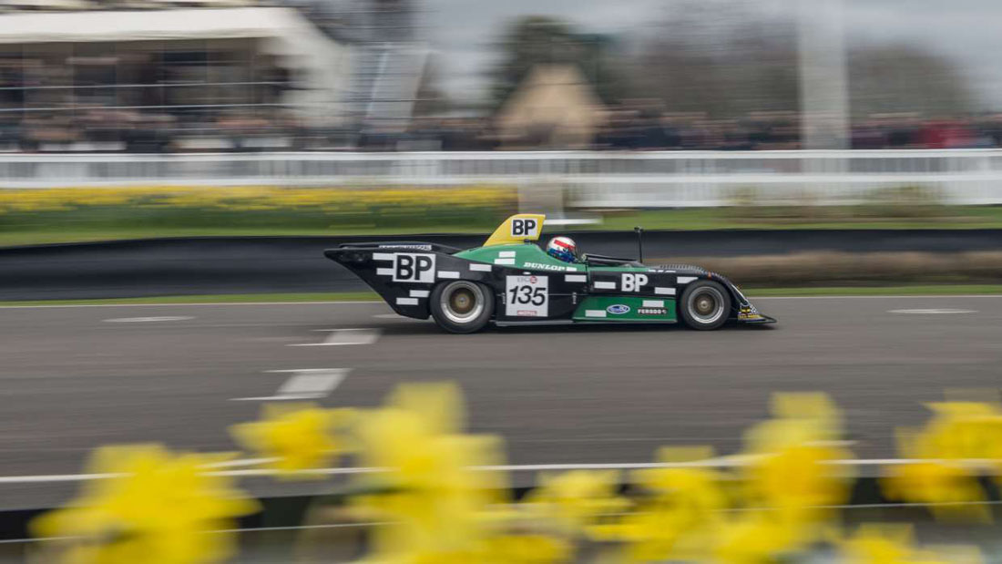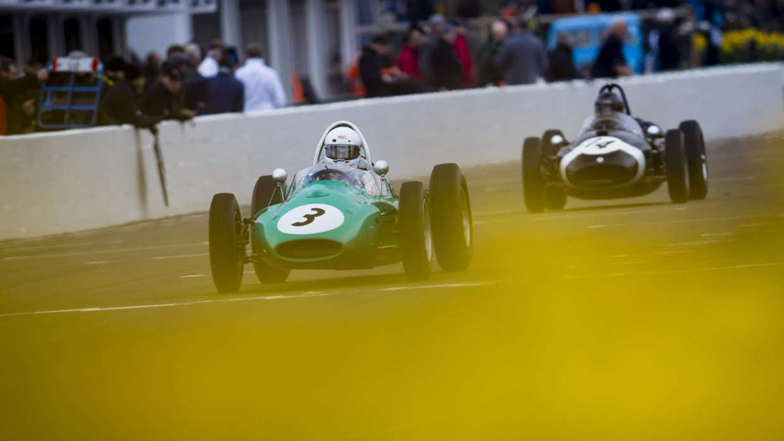 Andrew Hibberd war eine Klasse für sich als er beim Derek Bell Cup beim 75sten Members‘ Meeting zu Ehren kam. Das Rennen für 1-Liter Formel3 „Screamers“, sah viel Action auf und ab und Pole-Besitzer Hibbert erlebte einen „grasigen“ Moment in der ersten Runde, nur um dann einen konkurrenzlosen Sieg einzufahren. Während des 20-Minuten Rennens entschwand er einfach in der Ferne und steuerte seinen Ex-Champion Brabham BT18, der in Goodwood regelmäßig siegte. Hibberds Siegvorsprung waren erstaunliche 39 Sekunden.