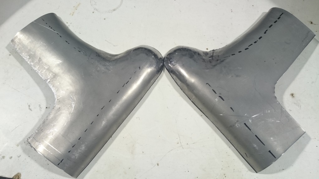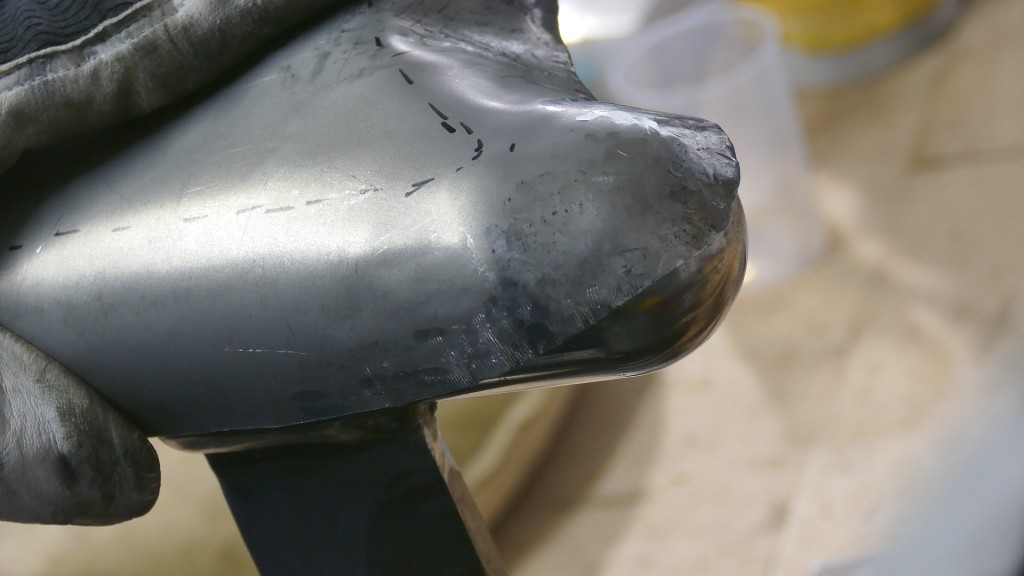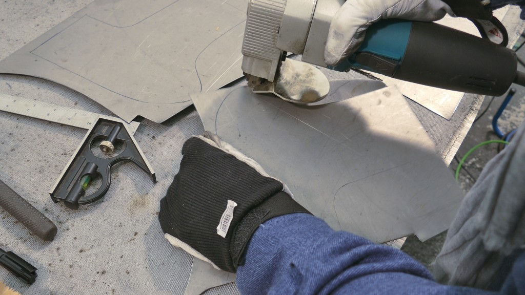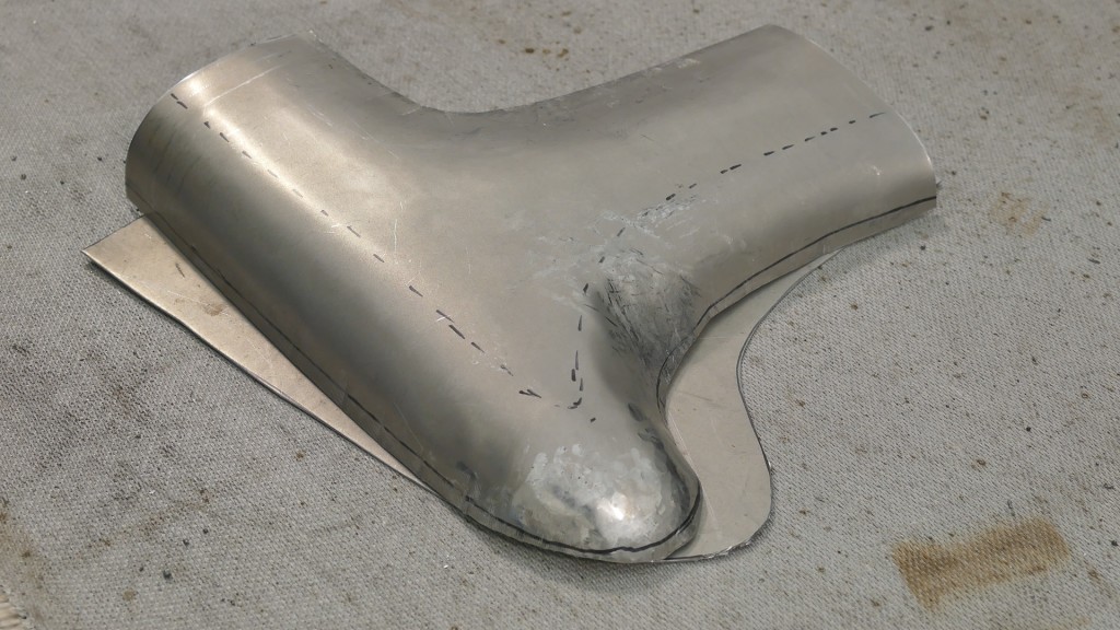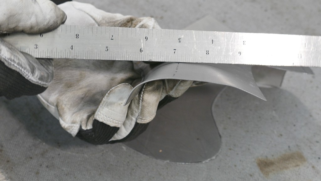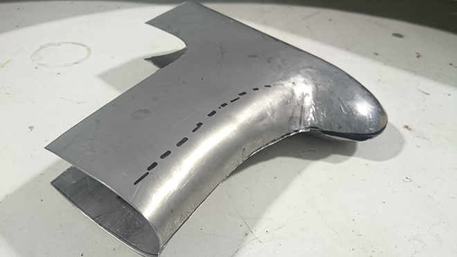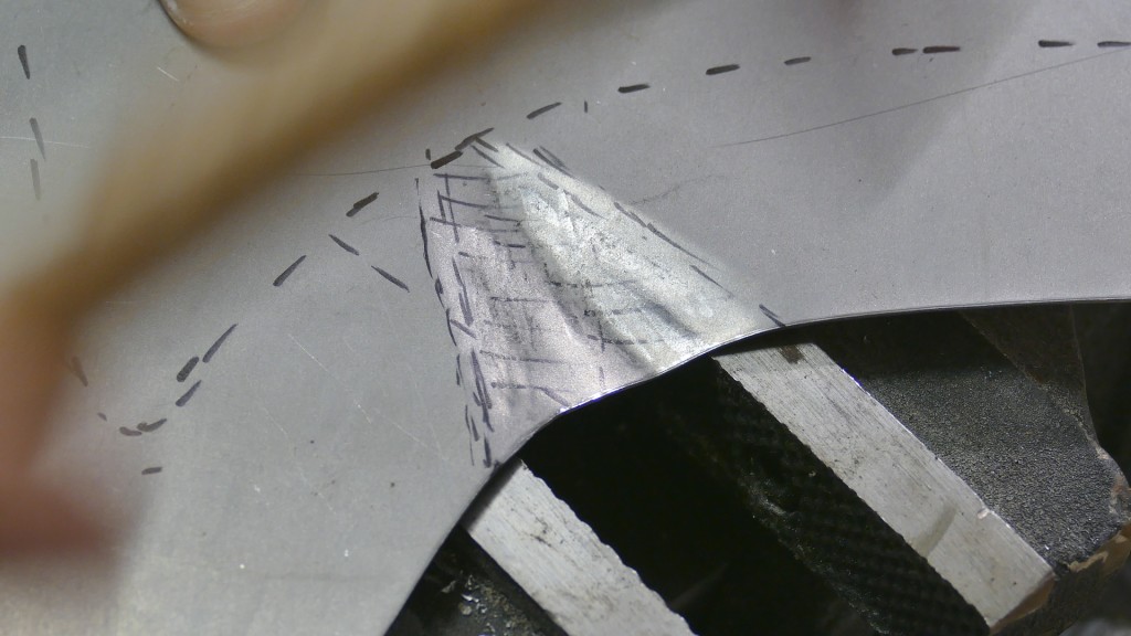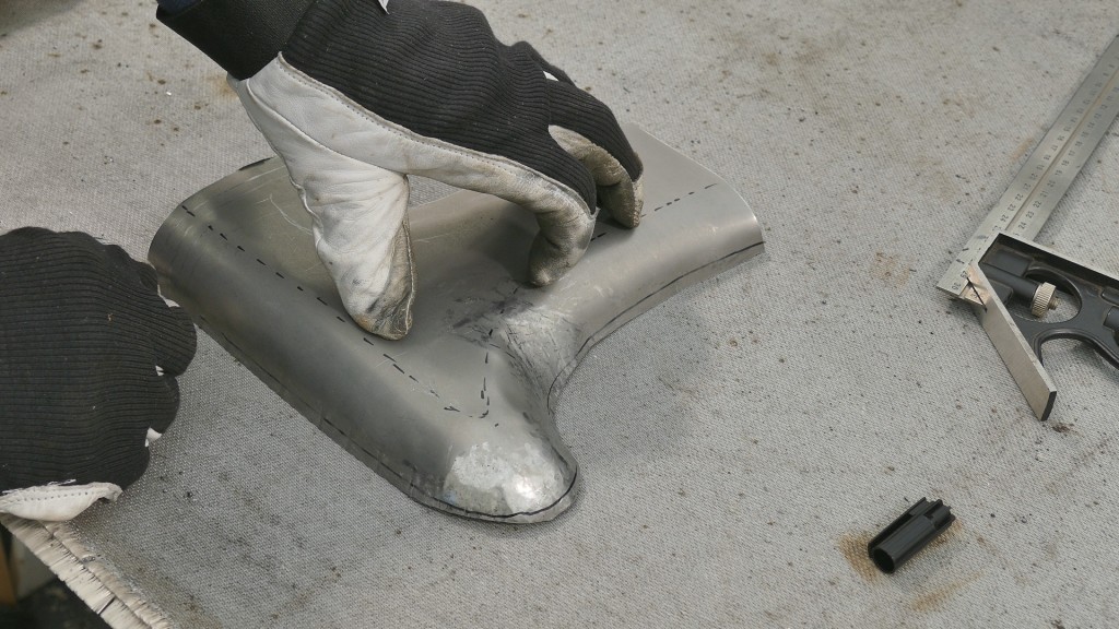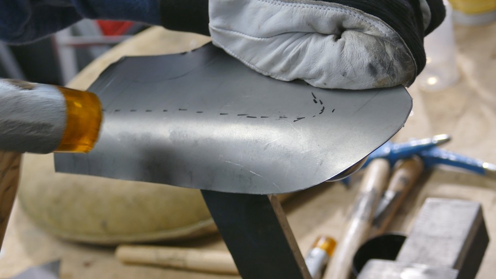 Sind beide Teile zugeschnitten, muss an dem inneren Radius der Ausbuchtung das Blech gestreckt werden um später beim Umformen ein Verziehen der Form zu vermeiden. Dazu wird das Blech Keilförmig gestreckt.
