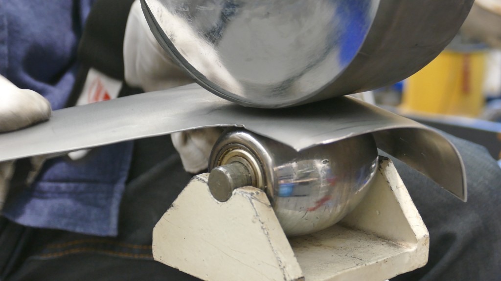 Im nächsten Schritt wird nun die Wölbung in das Blech gebracht. Dazu wird das gesamte Blech entlang der Oberkante durch die Rollenstreckmaschine mit einem über das Glätterad gezogenes Gummiband gerollt. Damit wölbt sich das Blech, wir aber nicht in alle Richtungen gestreckt.