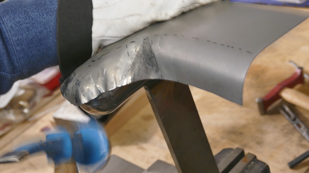 Im nächsten Schritt werden die Flanken der Stoßstangen Ecke an einem runden T-Stack abgerundet. Am besten eignet sich dazu ein Kunststoff-Hammer, da dadurch das Blech nicht gestreckt und ein Verzug vermieden wird. Die runde Ausbuchtung wird mit einer Faltengabel vorbereitet. Stückweise werden Falten in die Rundung gezogen. Dadurch wird das Blech gestaucht und bildet die gewünschte Wölbung. An den abgerundeten Enden des T-Stacks wird nun die Wölbung geglättet. Dies geht nur stückweise und mit streichenden Schlägen mit dem Glättehammer. Das Faltenlegen muss eventuell noch einmal wiederholt werden. Nur werden die Falten dieses Mal kürzer gelegt. Nochmals wird nun an der Rundung des T-Stacks die Wölbung geglättet. So lange, bis die gewünschte Form erreicht ist.