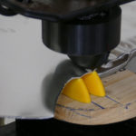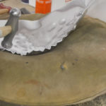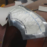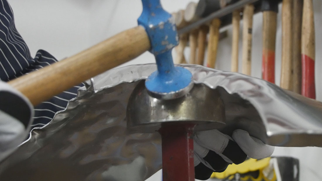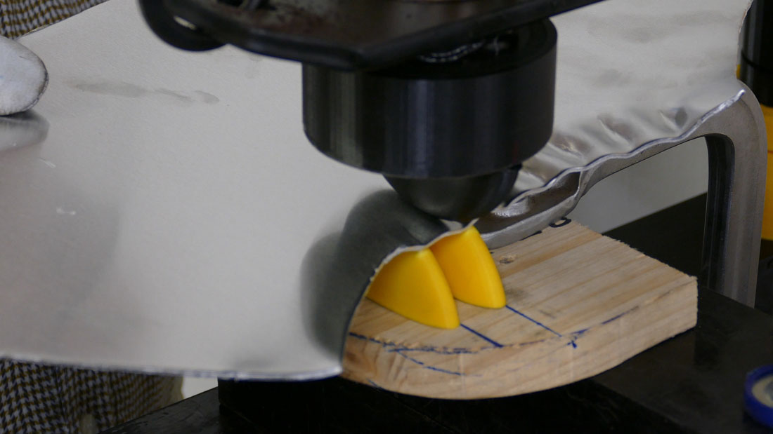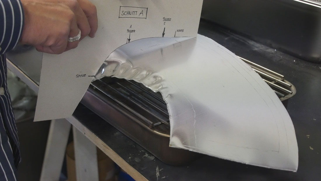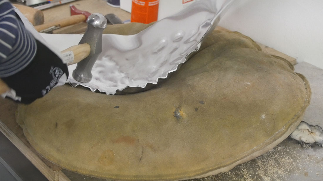 Auf einem Sandsack wird das Blech mit einem Kugelhammer in Form getrieben. Die entstandenen Unebenheiten im Blech knnen an einem Rundstock-Amboss mit einem Glttehammer geglttet werden. Jetzt wird zum ersten Mal die Formschablone auf das Blechteil aufgelegt und die notwendigen Linien bertragen.