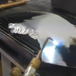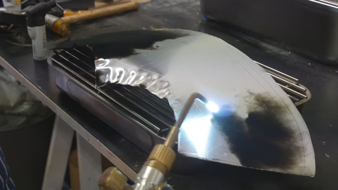 In unserem Fall beginnen wir das Blech entlang des vorderen Randes zuStauchen. Dazu legen wird Falten entlang des Randes in das Blech. Wirarbeiten hier mit einem 3mm Aluminium Blech, aber bis auf das Tempern, das wir spter erklren, ist bei Blech kein Unterscheid in der Verfahrensweise.Die Falten im Blech haben uns schon einmal die vordere Grundwlbunggebracht. Nun muss das Blech im Inneren noch gestreckt werden, damit die Form erreicht wird.Da wir mit einem 3mm Aluminiumblech arbeiten, muss das Blech erst einmal weich gemacht werden. Dies geschieht durch das sogenannte Tempern. Mit einer Acetylen-Flamme wird das Blech eingerut. Es entsteht eine dnne schwarze Ruschicht auf dem Aluminium. Durch die Zugabe von Sauerstoff in die Acytelen-Flamme, wird die Flamme heier. Erkennbar an der blauen Frbung der Flamme und einer kleinen weien Zunge der Dse des Brenners. Mit dieser Flamme wird die Ruschicht abgebrannt. Der Ru dient als Indikator. Die Flamme muss stndig in Bewegung bleiben, damit das Aluminium nicht durchbrennt. Sobald der Ru durchgehend entfernt ist, ist das Blech sehr weich und lsst sich gut weiter verarbeiten. Vor der Weiterverarbeitung muss das Blech allerdings langsam abkhlen, denn es ist durch das Tempern sehr hei geworden.