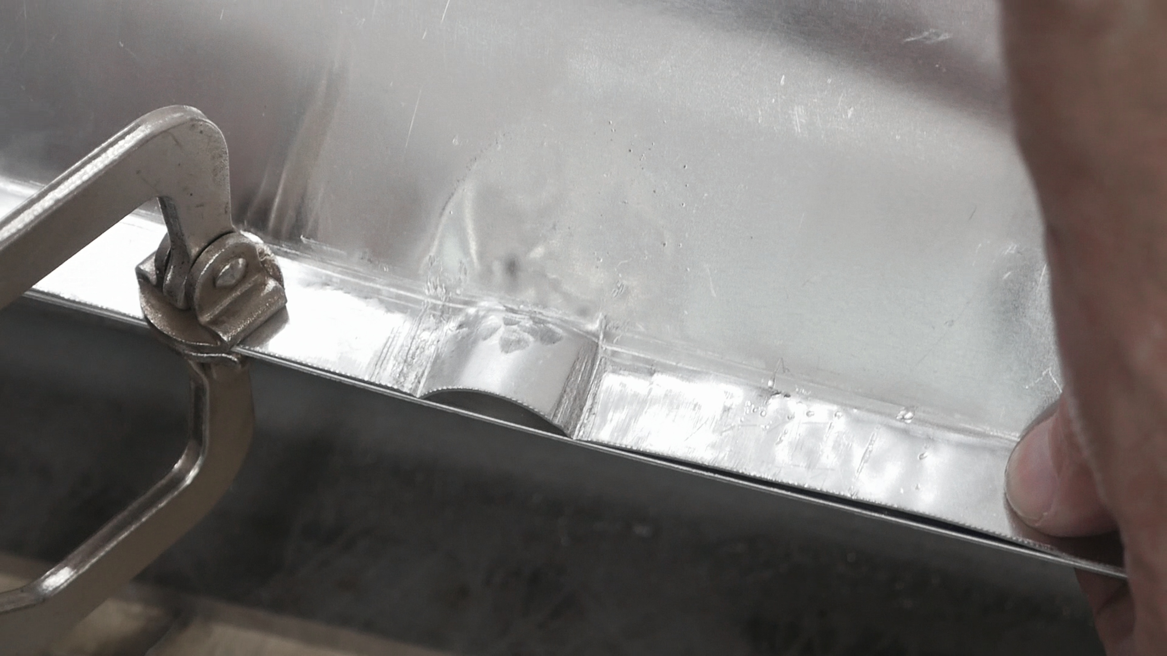 Um diese Sicken zu formen, kann eine abgerundete Feile verwendet werden. Das Schwellerblech wird ueber die Feile gespannt und mit einem stumpfen Meisel entlang der Kante der Feile die Sicke geformt. Das Blech wird beidseitig in Richtung der Feile getrieben. Mit einem harten Kunststoffhammer wird das Blech final rund um die Feile getrieben. Es entsteht eine gleichmaessige Sicke. Eventuell gibt es am Ende der Sicke einen kleinen Knick. Das Blech wird umgedreht und die Delle auf einem flachen Amboss glatt getrieben. Die Ablaufsicke ist damit fertig geformt und kann nun entsprechend mit dem Gegenblech verschweisst werden.