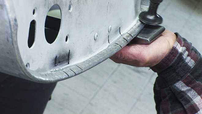 Um die Bördelkante zu flachen, wird nun mit einem Glättehammer die Bördelkante flach getrieben. Um auch hier die äußere Form nicht zu verformen, wird auch hier der Hammer nur mit streichenden Bewegungen geführt.