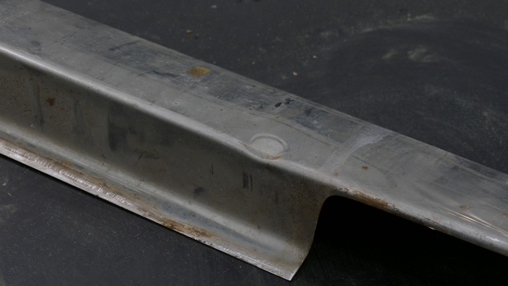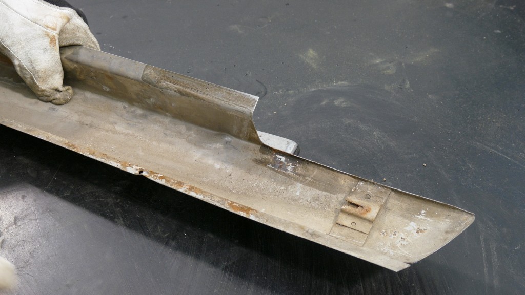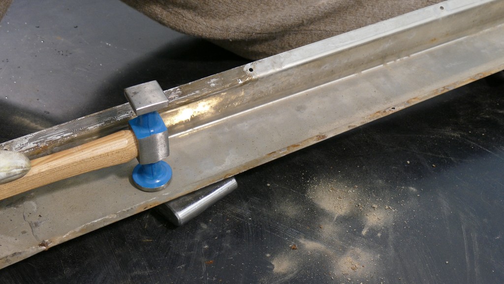 Die Dellen entfernen wir, damit sich an diesen Knickstellen keine kleinen Haarrisse bilden, die der Korrosion Angriffsfläche bieten könnten. Zwei größere Dellen sind besonders kritisch, denn sie liegen direkt an der Falzkante der Zierleiste. Dadurch ist die Zierleiste auch leicht verzogen. Daher müssen diese beiden Dellen als erstes herausgearbeitet werden. Mit der Hilfe eines flachen Fäustlings und eines leichten Glättehammers wird zuerst einmal von der Innenseite aus die entstandene Beule in der Flanke geglättet. Der leichte Glättehammer ist sehr bewusst gewählt, denn der Glättevorgang wird mit nur ganz sanften Treibbewegungen durchgeführt. Der Hammer wird eher sogar auf die Stelle fallengelassen, denn erstens sollen keine Treibspuren entstehen und zum Zweiten soll auch kein weiterer Verzug entstehen. Würde man das Blech zu fest auf den Fäustling treiben, entsteht eine Dehnung des Blechs. Die Kante wird im nächsten Schritt mit einem Finnen-Hammer in Form gebracht. Durch das Glätten und begradigen der Kante, ist der Verzug an der Stelle auch bereits behoben. Auch die zweite Stelle wird ähnlich bearbeitet.