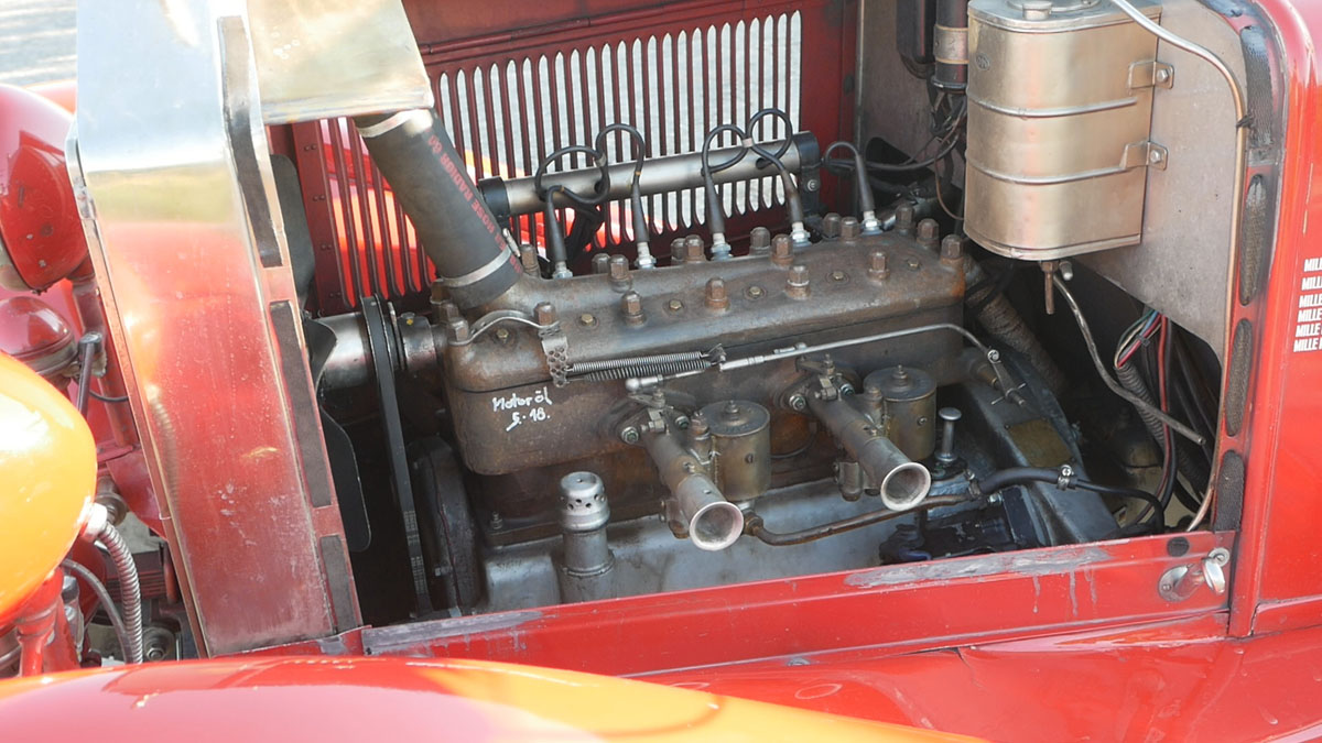 Das hier gezeigte Fahrzeug ist eines der Modelle mit kurzem Chassis, die fr die Mille Miglia Teilnahme aufgebaut wurden. Auf dem kurzen Chassis ist ein zweisitzige Roadster Karosserie. Die MM Modelle zeichnete ein geringeres Gewicht und eine hhere Kompressionsrate aus. Das Lenkrad sitzt, wie fr die damalige Zeit blich, auf der rechten Seite.