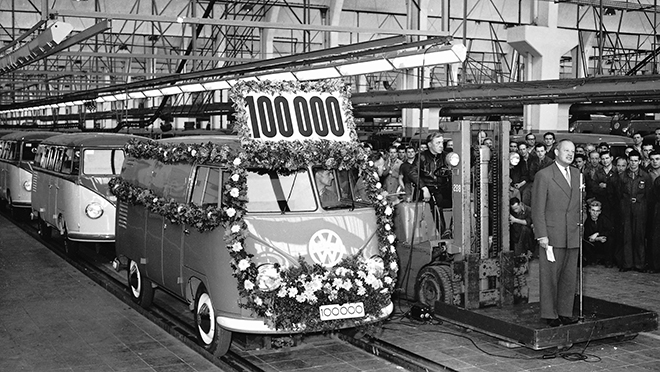 Vier Jahre nach Produktionsstart läuft in Wolfsburg der 100 000ste Volkswagen-Transporter vom Band. 30 verschiedene Modelle gibt es inzwischen. Die Tagesproduktion in Wolfsburg liegt bei 80 Fahrzeugen. Mehr geht nicht, denn das Werk ist schon wegen der Käferproduktion ausgelastet. Es wird immer deutlicher: Der Transporter braucht ein eigenes Werk.