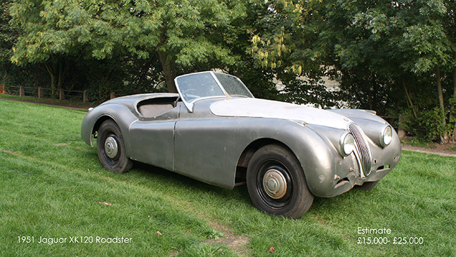 Ein früher Jaguar E-Type, der in einer Garage bei Le Mans, Frankreich gefunden wurde und ein XK120 aus einem Unterstellplatz in Essex, UK werden von Coys in der Auktion ‚Spirit of Motoring‘ aufgerufen.