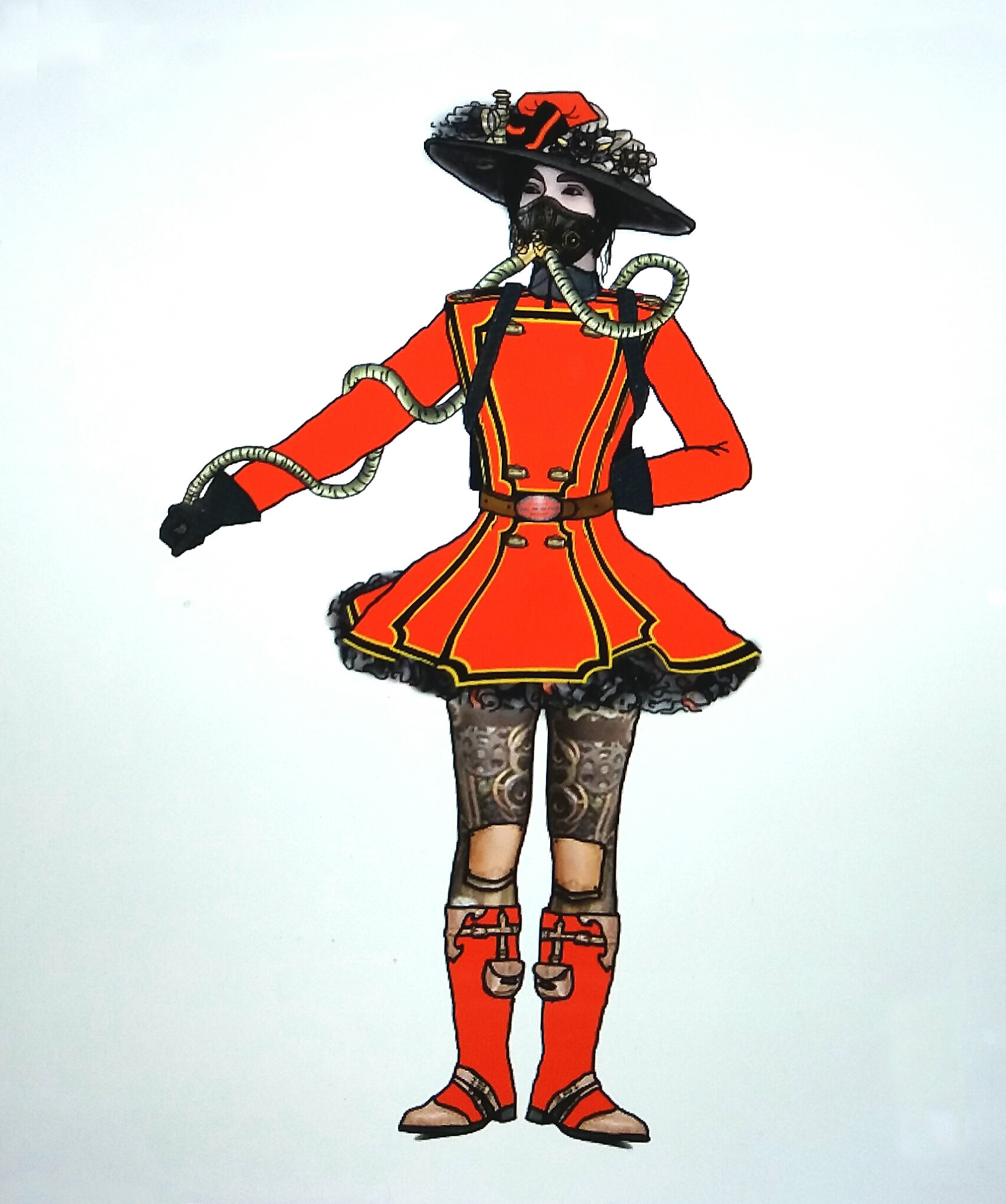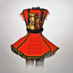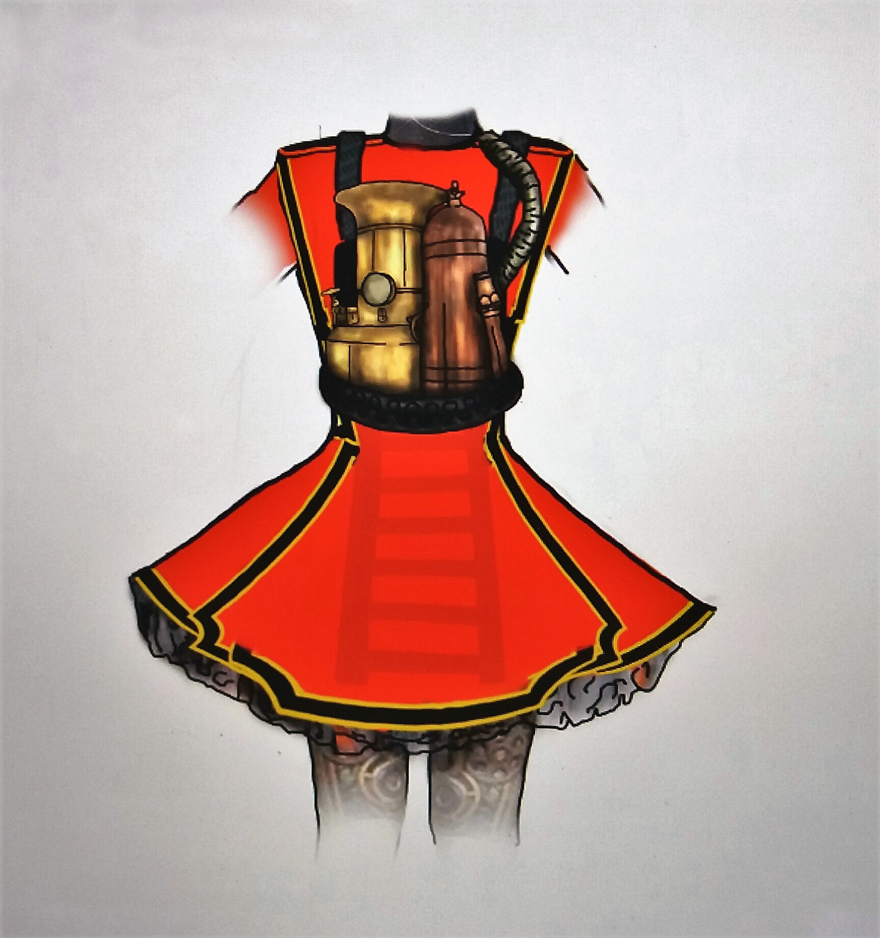 Zum Beispiel der Gobron Brillie Feuerwehrwagen. Das Kostüm dazu in Richtung eines traditionellen Atemapparates eines Feuerwehrmannes geht und LED-Lichter im Rock eingenäht hat. Andere Fahrzeuge als Mode-Vorbild sind der Columbia Electric Wagen, ein frühes Elektrofahrzeug, verwendet von Queen Alexandra, um auf dem Gelände des Sandringham House zu fahren. Details wie die Rad-Speichen wurden in einen Hut integriert.