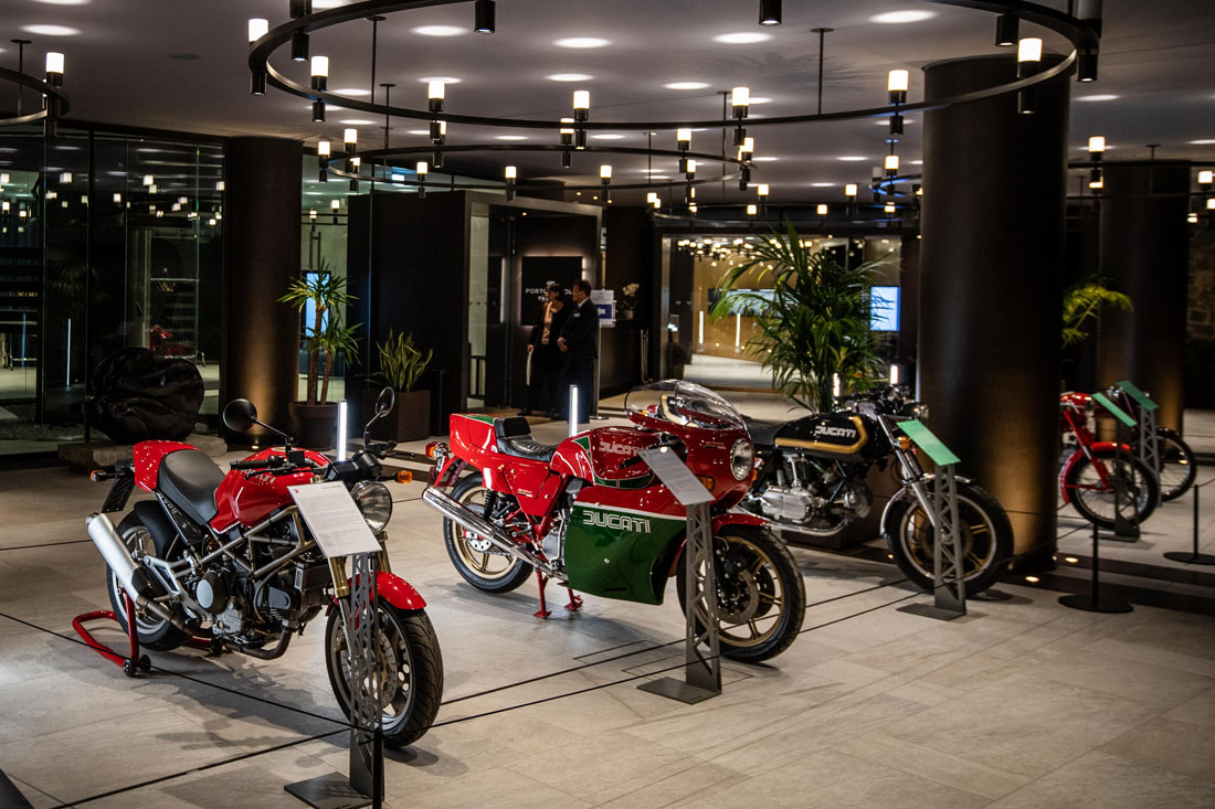 Darber hinaus waren auf dem Event acht Ducati Motorrder prsent, die die Historie und Evolution der Renn- und Straen Motorrder aus Bologna Borgo Panigale von 1946 bis heute zeigten. Der Stammvater Cucciolo von 1946, war flankiert von Ducati 65, 1952, 125 TV, 1960,Darmah 900, 1978, Mike Hailwood Replica 1997, Monster 900, 1994, 996 Giallo, 2000, und der aktuellen Panigale 25 Anniversario.
