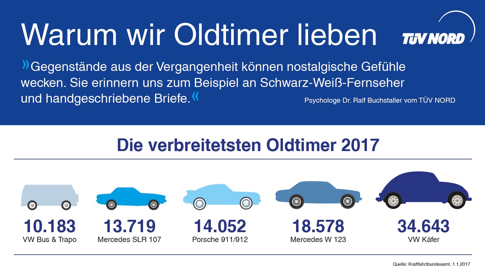 Großen Wert haben die Vierräder allerdings für Herz und Seele ihrer Besitzer. „Gegenstände aus der Vergangenheit können nostalgische Gefühle wecken“, erklärt der Diplompsychologe Dr. Ralf Buchstaller von TÜV NORD. „Sie erinnern uns an Zeiten, in denen im Schlafzimmer noch Schwarz- Weiß-Fernseher standen und der Postbote handgeschriebene Briefe brachte.“