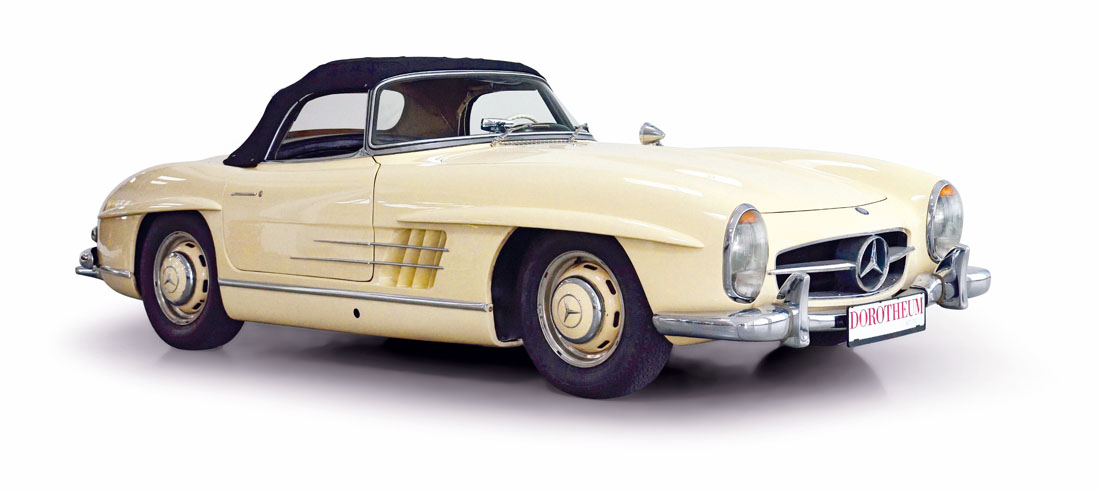 Ein elfenbeinfarbener Mercedes-Benz 300 SL Roadster Baujahr 1960 glänzt durch seine Originalität. Er war der Ausstellungswagen auf der London Motor Show 1960. 40 Jahre lang war diese Autolegende bei einem österreichischen Besitzer. 850.000 bis eine Million Euro soll das 215 PS starke Gefährt seinem neuen Gefährten wert sein.