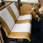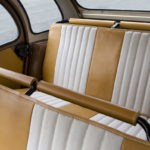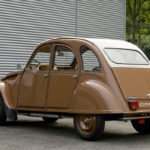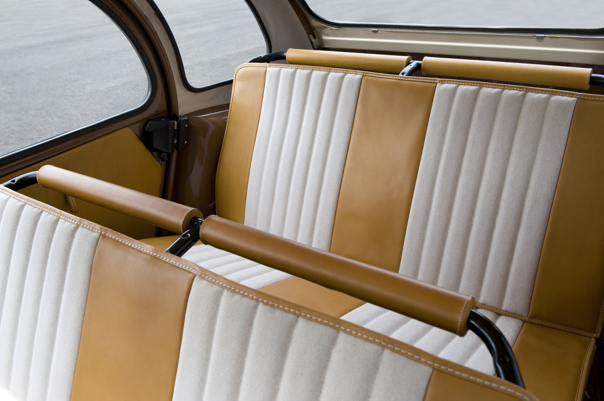 Der in Braun neu lackierte 2CV 6 Spcial von 1989 erhlt eine natrliche Lederausstattung an den Trverkleidungen, dem Innenrckspiegel, dem Schaltknauf, dem Lenkrad und der Sonnenblende des Fahrers. Fr ein noch eleganteres Finish sind die beiden Sitze mit grau-beige Baumwollsegeltuch und Naturleder bezogen. Zum Abschluss sind die Motorhaube und die Innenverkleidung am Heck des Fahrzeugs mit Hermes Baumwollsegeltuch versehen.