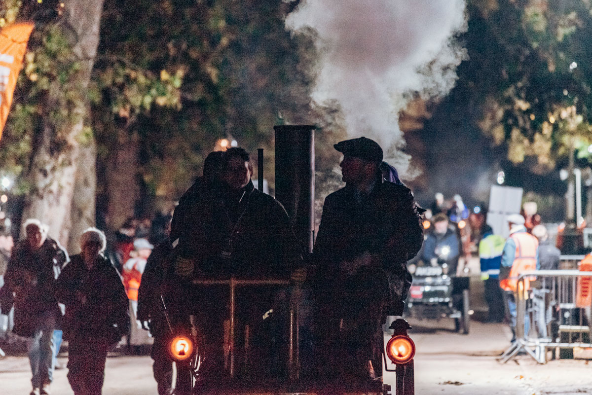 Von Hyde Park aus fuhr zunchst ein einzylindriger, 1,5 PS starker Velo-Benz aus dem Jahr 1894. Zu den frhen Startern gehrte auch der 1896er Salvesen Steam Cart, eine Dampflokomotive, die mit Heizer auf der Strae fuhr Schaufeln Sie Kohle in den feurigen Ofen des Kessels sowie eine stimmungsvolle Choo-Choo-Dampfpfeife – und eine Reihe primitiver motorisierter Dreirder mit Fahrern und Passagieren in historischen Kostmen.
