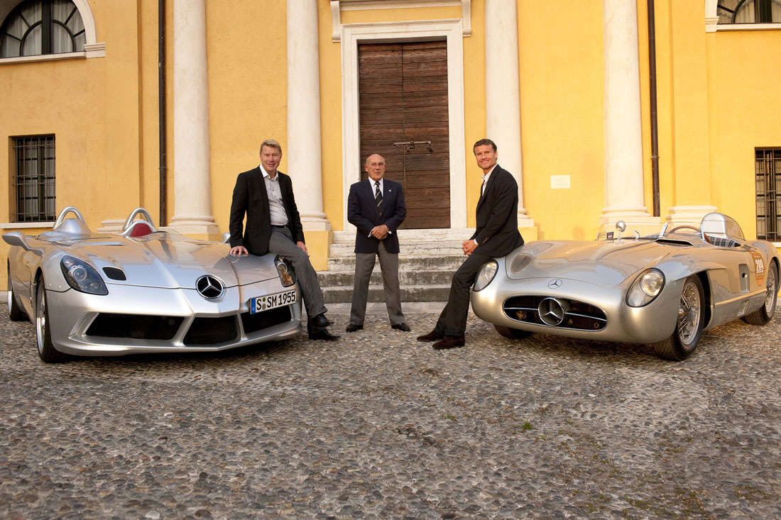 Darber hinaus wird einer der nur 21 zum Rennwagen umgebauten SLR 722 GT prsentiert, sowie der SLR Stirling Moss: Eine Reminiszenz an die SLR Rennsportfahrzeuge, die den Mythos der Silberpfeile begrndeten und eine Hommage an Sir Stirling Moss. Lediglich 75 Stck wurden von diesem auergewhnlichen Fahrzeug ohne Dach und Windschutzscheibe gebaut. Mit dieser Sonderauflage endete 2009 die Produktion des SL.